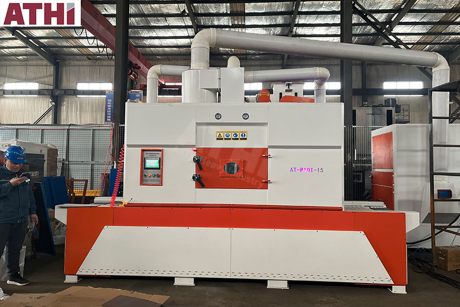 本机主要由:进出工作台、喷砂室、喷砂(旋转)系统、吹净室、工件输送系统、砂料输送系统、旋风分离系统、电控系统、除尘系统等组成。