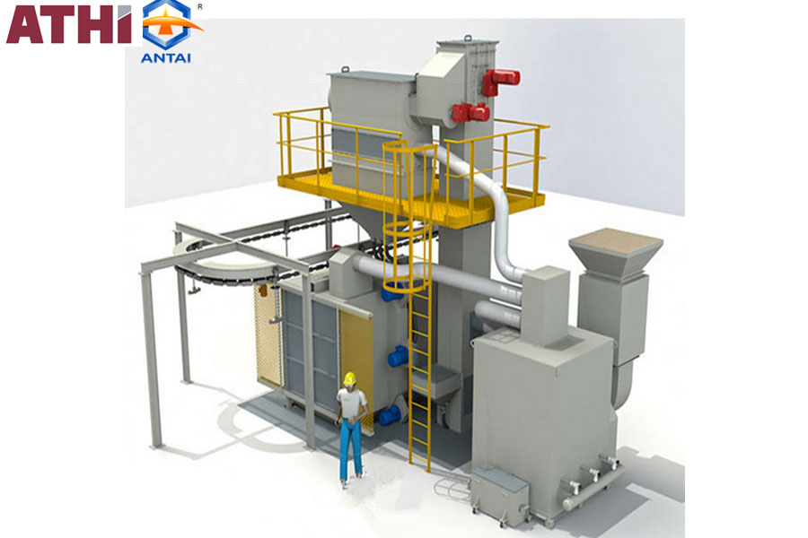 【工艺】:工件随吊链可连续运行、步进运行或积放推式输送,使工件在装卸区和抛丸区分别处于停止状态,实现定点装卸和定点抛丸,生产率高,运行可靠。