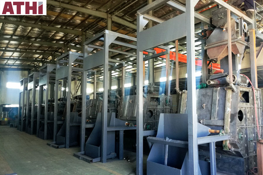 【设备构成】:该机主要由清理室、橡胶履带、吊门、抛丸器、加料机构、提升机、螺旋输送器、分离系统、除尘系统、电器系统等部分组成。
