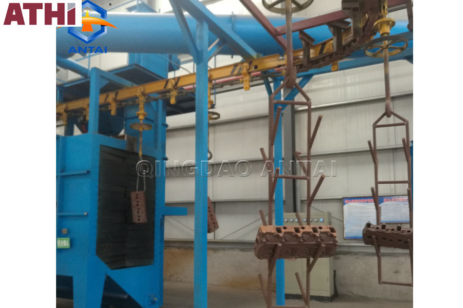 【工艺】:工件随吊链可连续运行、步进运行或积放推式输送,使工件在装卸区和抛丸区分别处于停止状态,实现定点装卸和定点抛丸,生产率高,运行可靠。