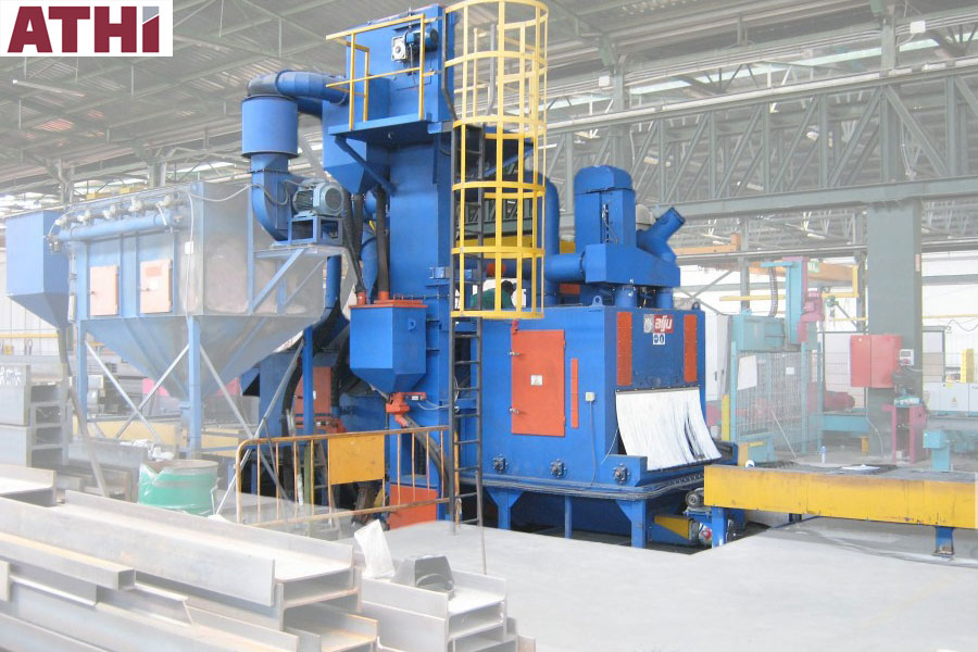【工艺】:该机清理过程中由电气控制的可调速输送辊道将钢结构件或钢材送进清理机室体内抛射区,其周身各面受到来自不同坐标方位的强力密集弹丸打击与磨擦,使之其上的氧化皮、锈层及其污物迅速脱落,钢材表面就获得一定粗糙度的光洁表面,在清理室外两边进出口辊道装卸工件。落入钢材上面的弹丸与锈尘经吹扫装置吹扫,撒落下来的丸尘混合物由回收螺旋输送到室体漏斗、纵横向螺旋输送机汇集于提升机下部,再提升到机器上部的分离器里,分离后的纯净弹丸落入分离器料斗中内,供抛丸循环使用。抛丸清理中产生尘埃,由抽风管送向除尘系统,净化处理后的净气排放到大气中,颗粒状尘埃被捕捉收集。