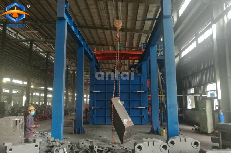 高架导轨喷砂机的门会自动打开,并将组件装载到安装在推车上的吊架上。然后关上门,操作喷砂轮单元。高速研磨剂会掉落在旋转的吊架上的部件上,吊架会在顺时针和逆时针方向上旋转一定的时间,并进行喷砂清理。喷砂清理周期结束后,关闭喷砂轮并自动打开门,并移出吊架以卸下组件。同时,Y形轨道上的另一个吊架也进入了抛丸机目的。