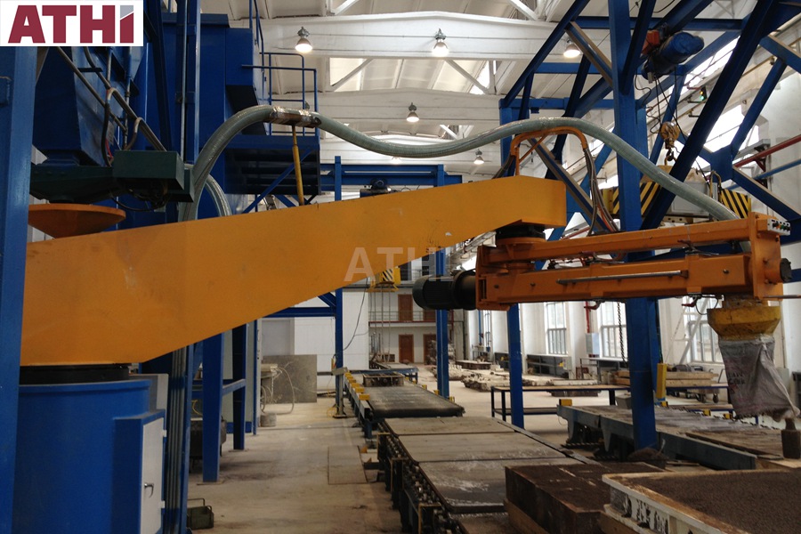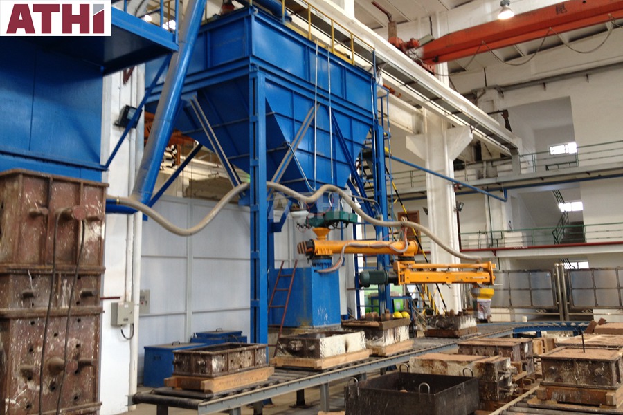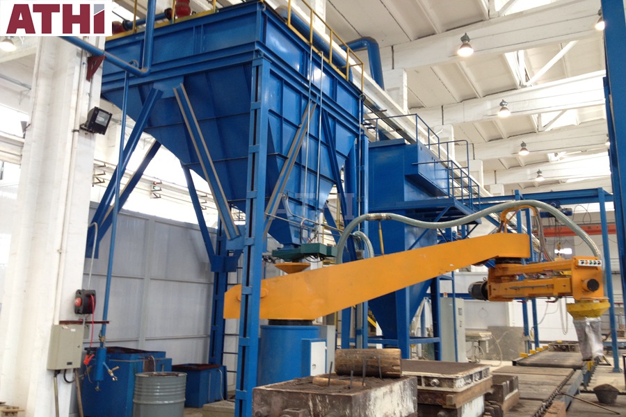 15908950799树脂砂生产线工艺流程:浇注后的砂箱及铸件由行车吊至惯性振动落砂机上,经落砂处理后,铸件运到清铲车间,砂箱运至砂箱库备用。大块夹皮,冒口由人工分拣,通过落砂栅格的砂子、砂团以及小块冷铁落至磁选皮带机,经磁选后输送至多功能振动破碎再生机进行破碎、脱膜、筛分,经过筛分后的砂子进1#斗式提升机,由提升机提升至离心转子二级再生机进行强力再生,充分脱膜。混合着微粉、灰尘、树脂膜的再生砂经流砂槽流入流幕式风选机,风选机连接着旋风除尘器及脉冲式反吹除尘器,将微粉、灰尘去除。再生离心转子二次二级再生机与砂库砂再经2#斗式提升机提升至砂库备用。移动双臂式连续树脂砂混砂机上方进料口由气动闸板与砂库下方出砂口相连,按下混砂机电控箱混砂按扭后,气动闸板自动打开,定好量的砂子由砂库流入混砂机。在混砂机中砂子经螺旋片向前输送至混砂开始端,自近端控制阀加入固化剂,经小叶片搅拢预混至后面的近端阀加入树脂,进入混砂端。固化剂、树脂、再生砂充分混匀后送至前端出料口自动流入准备好的砂箱内用于造型、制芯。此设备由进口PLC(编程可控)控制自动化性能卓越,适用于树脂砂工艺的中小铸造企业。